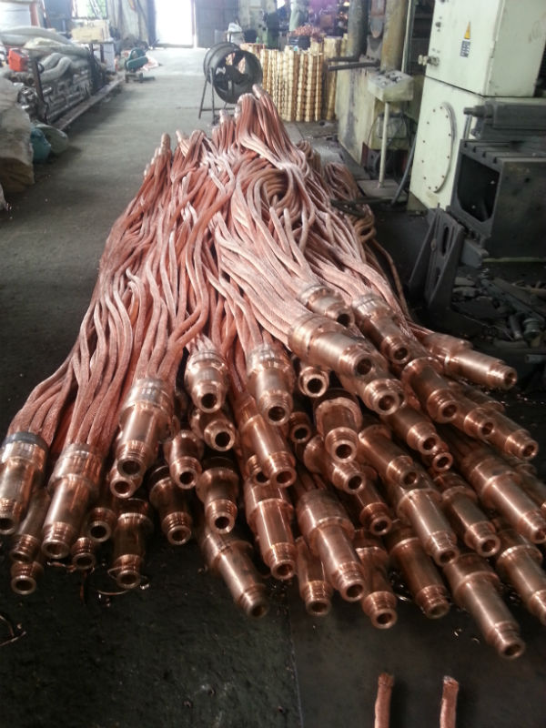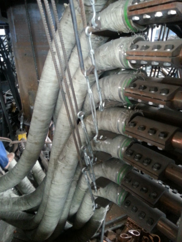 整套水冷線纜使用T2紫銅鍛造,并用超高溫耐火材料包裝,用于工業(yè)電爐強電流供電;具有強導電性和導熱性,使用水冷降溫系統(tǒng),使其可以在超高溫工業(yè)環(huán)境下良好工作。